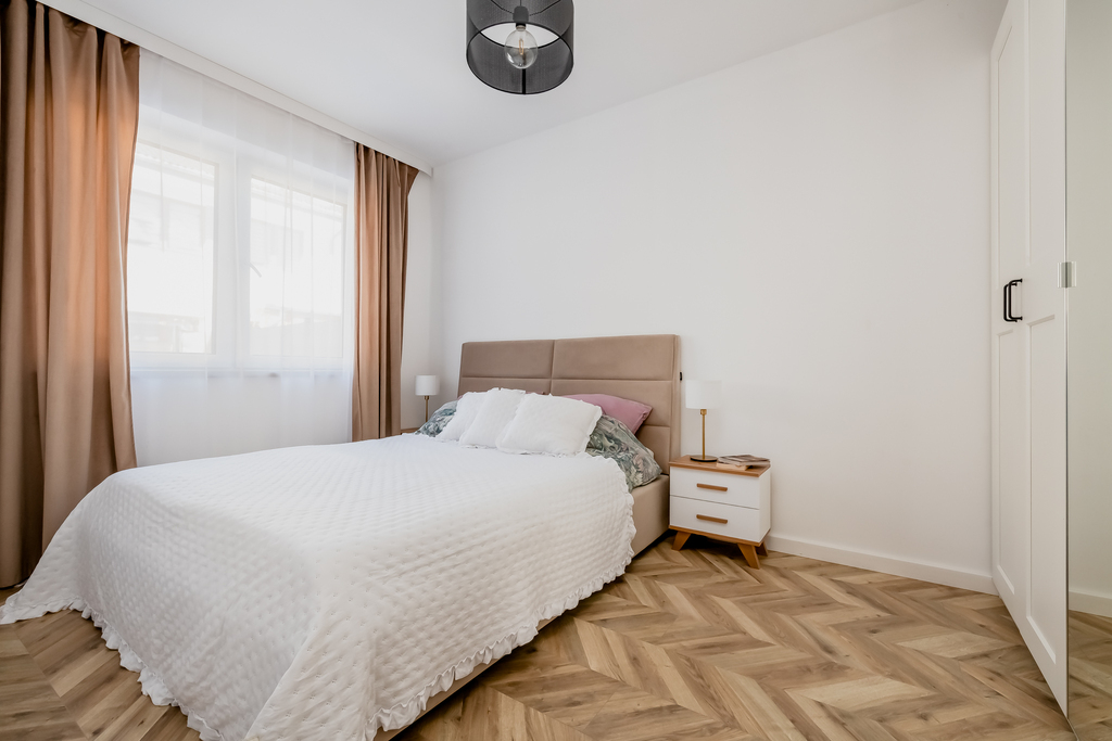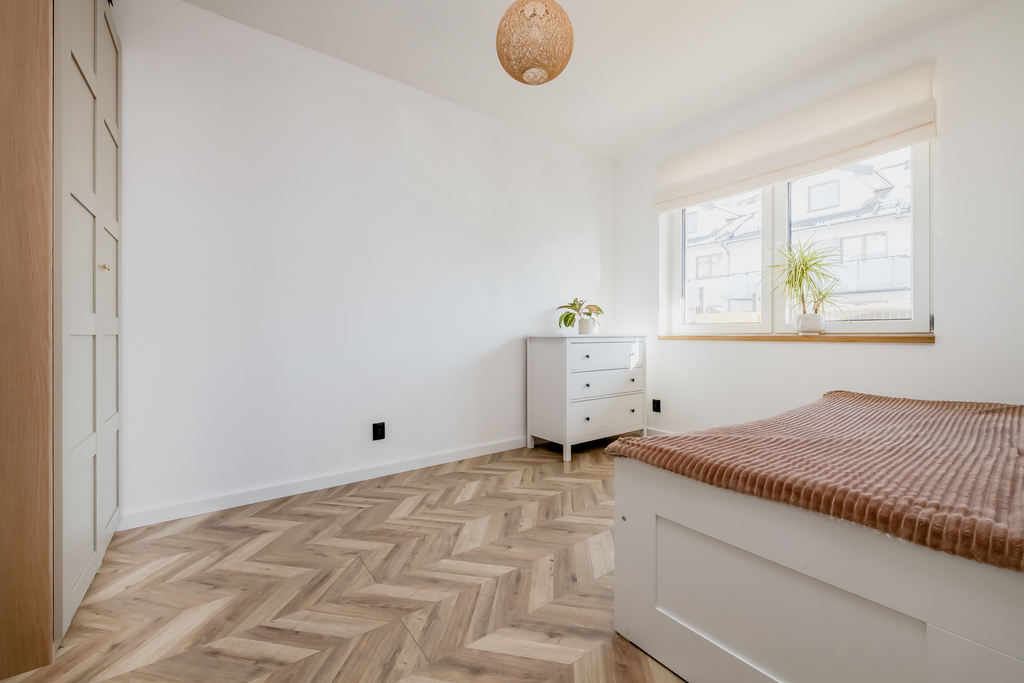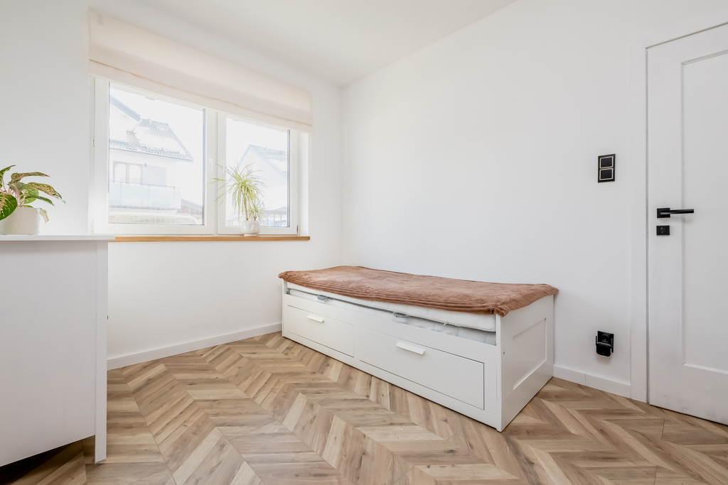 Dwie niezależne sypialnie tworzą prywatną strefę idealną dla rodziny, zapewniając każdemu domownikowi własną przestrzeń. Nowoczesna łazienka wyposażona jest w wannę z funkcją prysznica oraz zapewnia wygodę codziennego użytkowania dzięki przemyślanemu układowi i estetycznemu wykończeniu. Wiatrołap z szafą w zabudowie oraz praktyczne pomieszczenie gospodarcze zapewniają dodatkową przestrzeń do przechowywania.