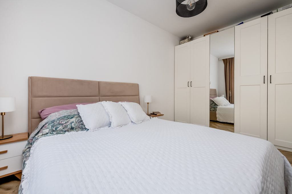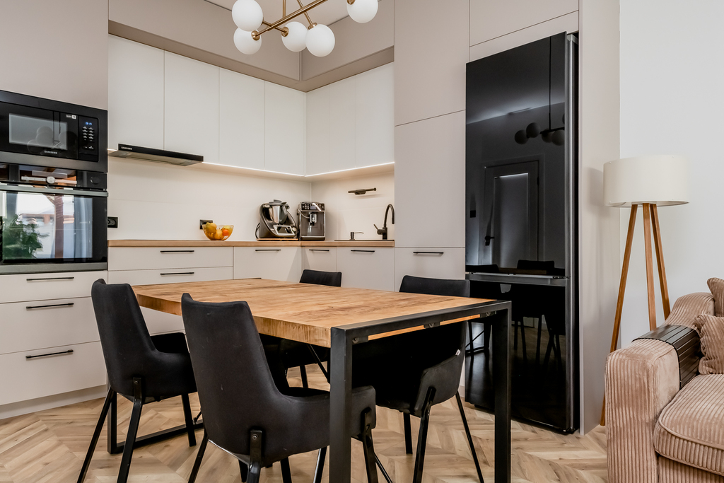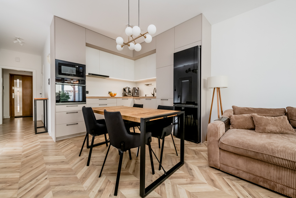 Przestronny salon z aneksem kuchennym stanowi serce mieszkania – jest w pełni wyposażony i bardzo komfortowy. Kuchnia została zaprojektowana na wymiar, łącząc funkcjonalność z estetyką.