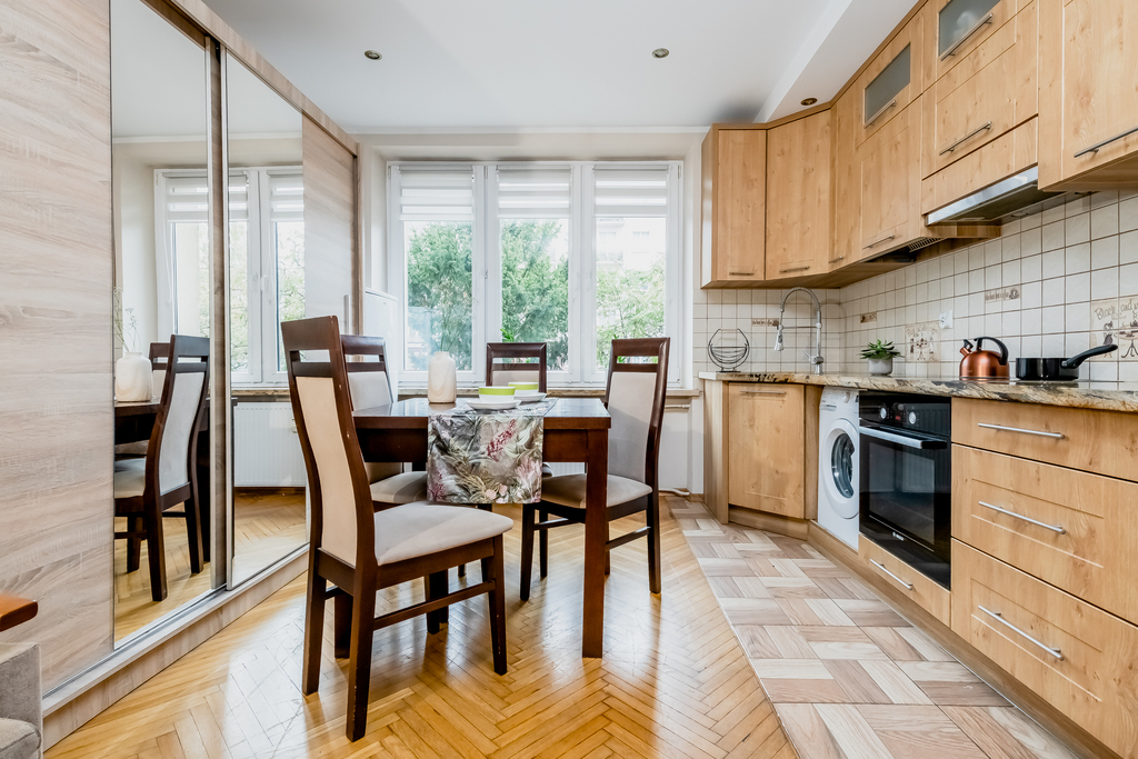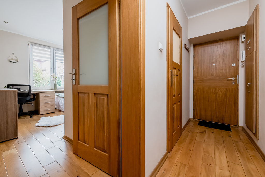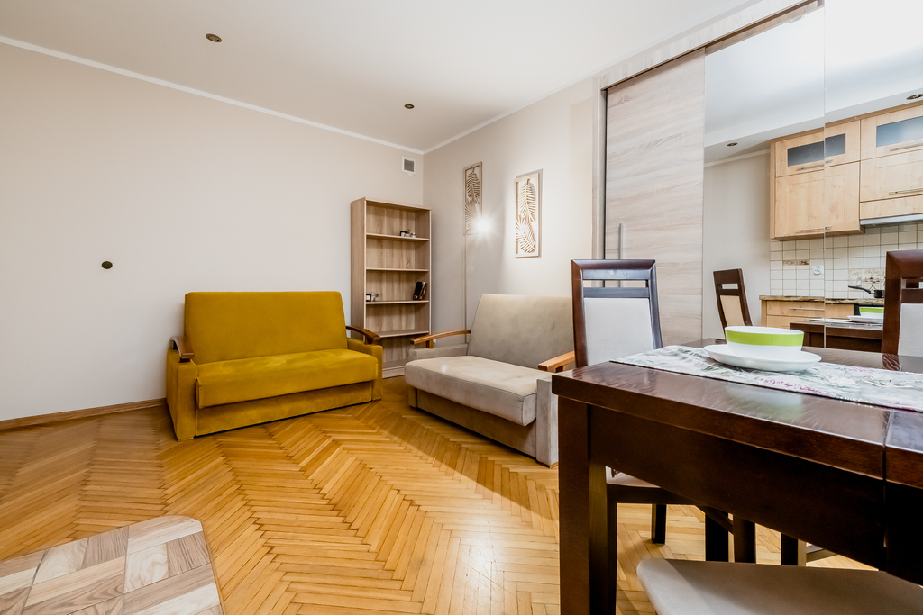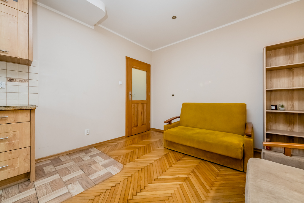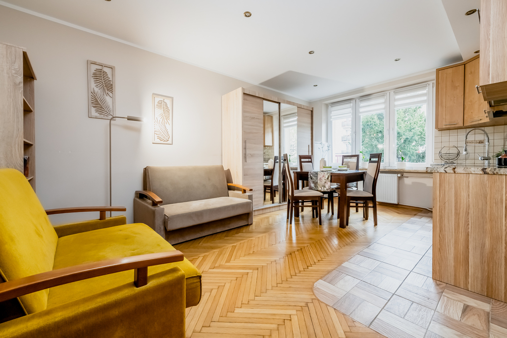 Funkcjonalne, dwupokojowe mieszkanie gotowe do wejścia, położone na parterze w doskonałej lokalizacji. Składa się z jasnego salonu z aneksem kuchennym, sypialni oraz łazienki. Aneks kuchenny wyposażony jest w zabudowę i pełny sprzęt AGD, co zapewnia wygodę codziennego użytkowania. Wnętrze jest w pełni umeblowane, utrzymane w bardzo dobrym stanie – nie wymaga żadnych dodatkowych nakładów. Odrębna sypialnia i praktyczny układ pomieszczeń sprawiają, że mieszkanie jest komfortowe i funkcjonalne. Atutem nieruchomości jest parkiet ułożony w klasyczną jodełkę, nadający wnętrzu elegancji i przytulnego charakteru.