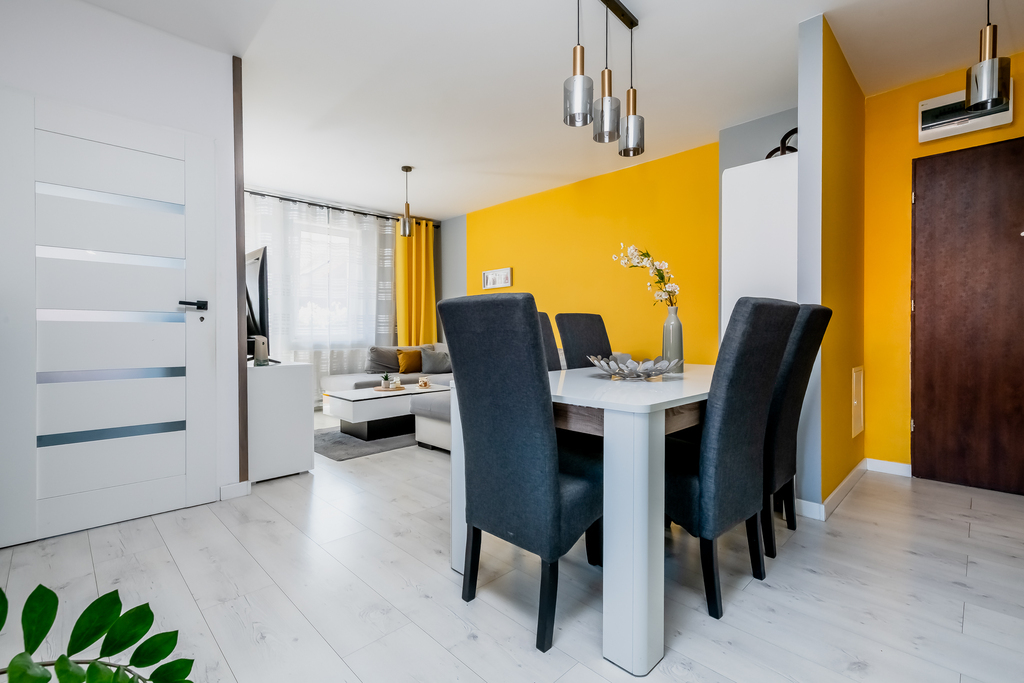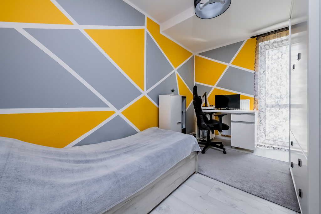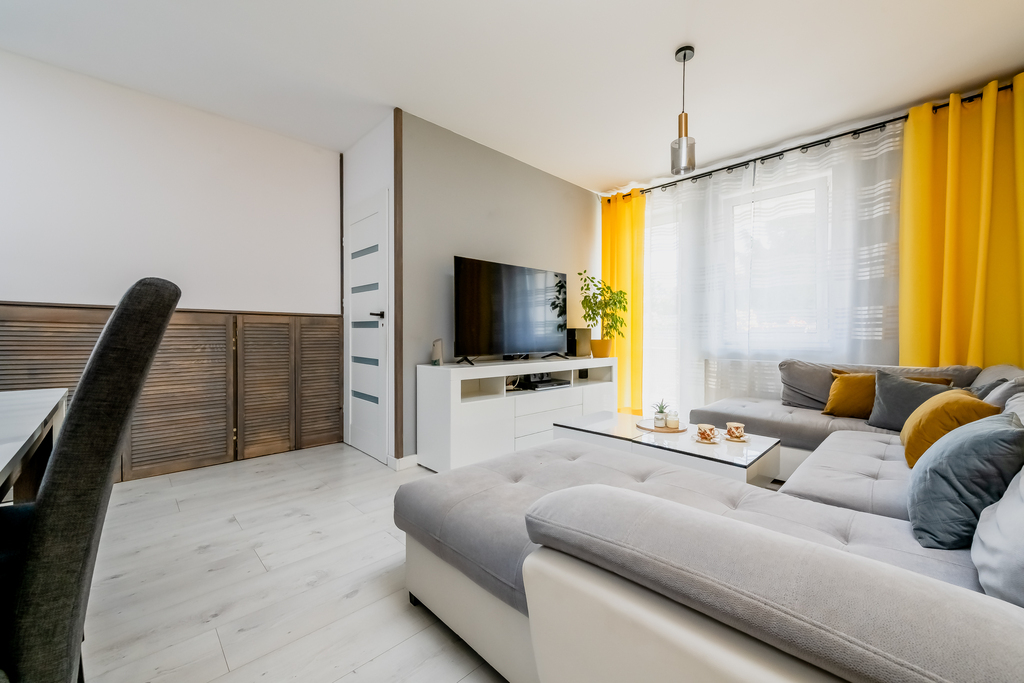 Wnętrze wymaga drobnego odświeżenia, a rozmieszczenie pomieszczeń umożliwia aranżację mieszkania według indywidualnych preferencji. Obecny układ oferuje trzy wygodne sypialnie i salon, przy czym pierwotnie przewidywał dwie. Istnieje możliwość łatwego przywrócenia większego salonu poprzez zlikwidowanie jednej z sypialni – wystarczy usunąć ściankę działową. Dzięki temu wnętrze można z łatwością dopasować do własnych preferencji i trybu życia.