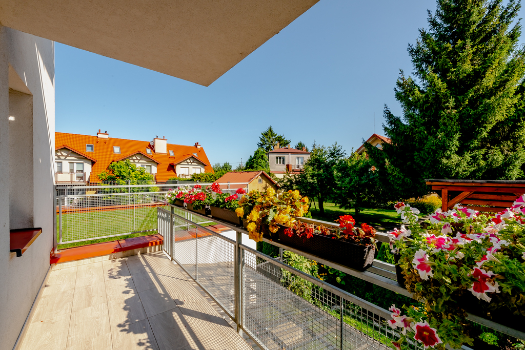 Ogromnym atutem jest narożny ogród z tarasem, częściowo zadaszony, który stwarza idealne warunki do relaksu, zabawy dzieci czy spotkań z przyjaciółmi. Mieszkanie posiada także duży balkon, co dodatkowo zwiększa funkcjonalność przestrzeni.
