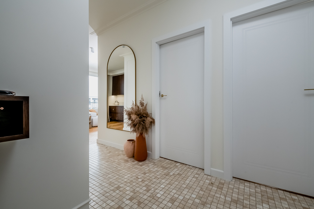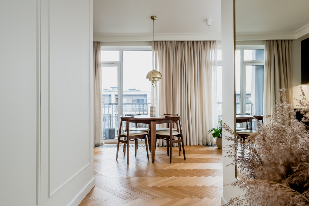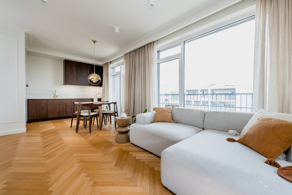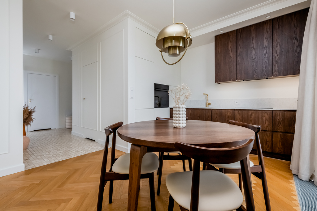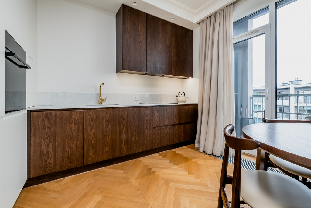 Wszystkie meble, zabudowy oraz szafy zostały wykonane na wymiar przez stolarza. Fronty to połączenie lakieru oraz naturalnego forniru drewnianego. W obu pokojach znajdują się pojemne, ergonomiczne szafy lakierowane. Kuchnia zaprojektowana z myślą o funkcjonalności, wyposażona w wysokiej klasy sprzęt AGD. Blat roboczy wykonany z konglomeratu Technistone. Łazienka w całości wykonana z mikrocementu, wyposażona w armaturę topowych marek. W salonie i pokojach położona została jodełka klasyczna – najwyższa klasa Elegance. Przestrzeń wejściowa, korytarz i łazienka wykończone zostały oryginalną mozaiką marmurową. Wszystkie drzwi wewnętrzne od renomowanej firmy Porta. Mieszkanie stanowi idealną propozycję dla osób ceniących estetykę, funkcjonalność i najwyższą jakość wykończenia. Zostało stworzone z myślą o komforcie, a każdy element jest przemyślany i dopracowany. Projekt architekta wnętrz oraz użycie ekskluzywnych materiałów czynią tę ofertę absolutnie unikatową na rynku.